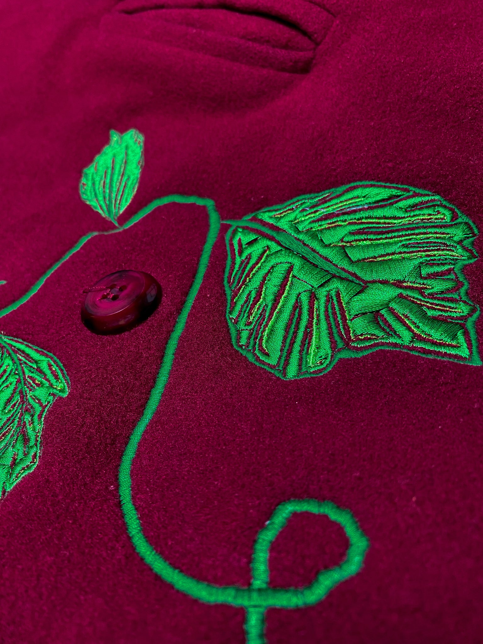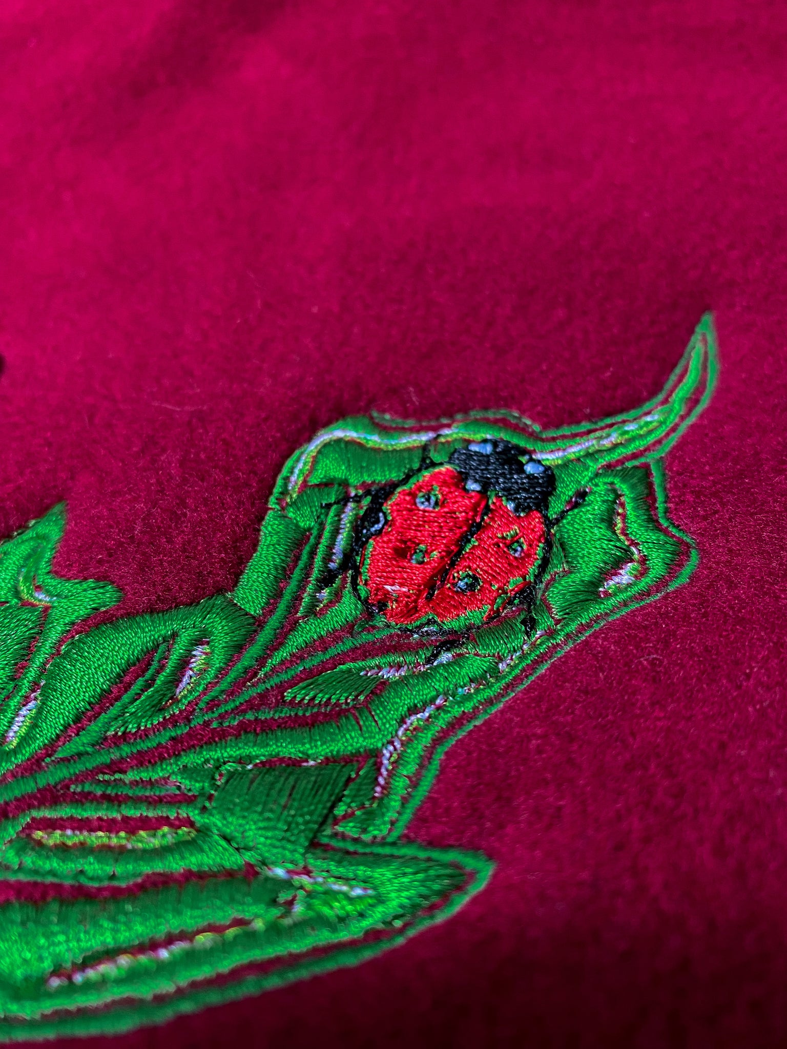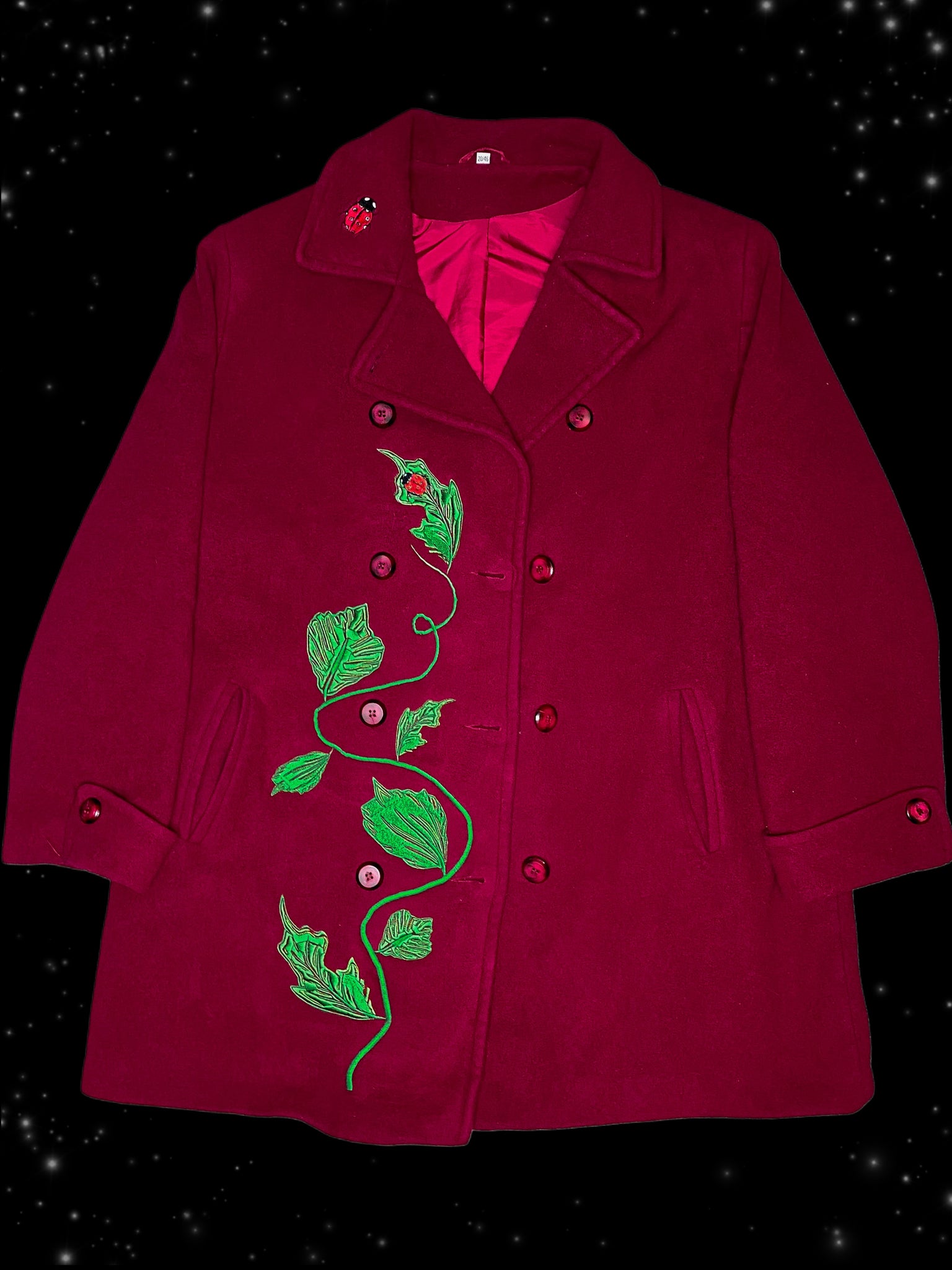 A dark ruby red overcoat, reworked with an embroidered dancing leafy vine, featuring two little ladybirds on the leaf and collar.