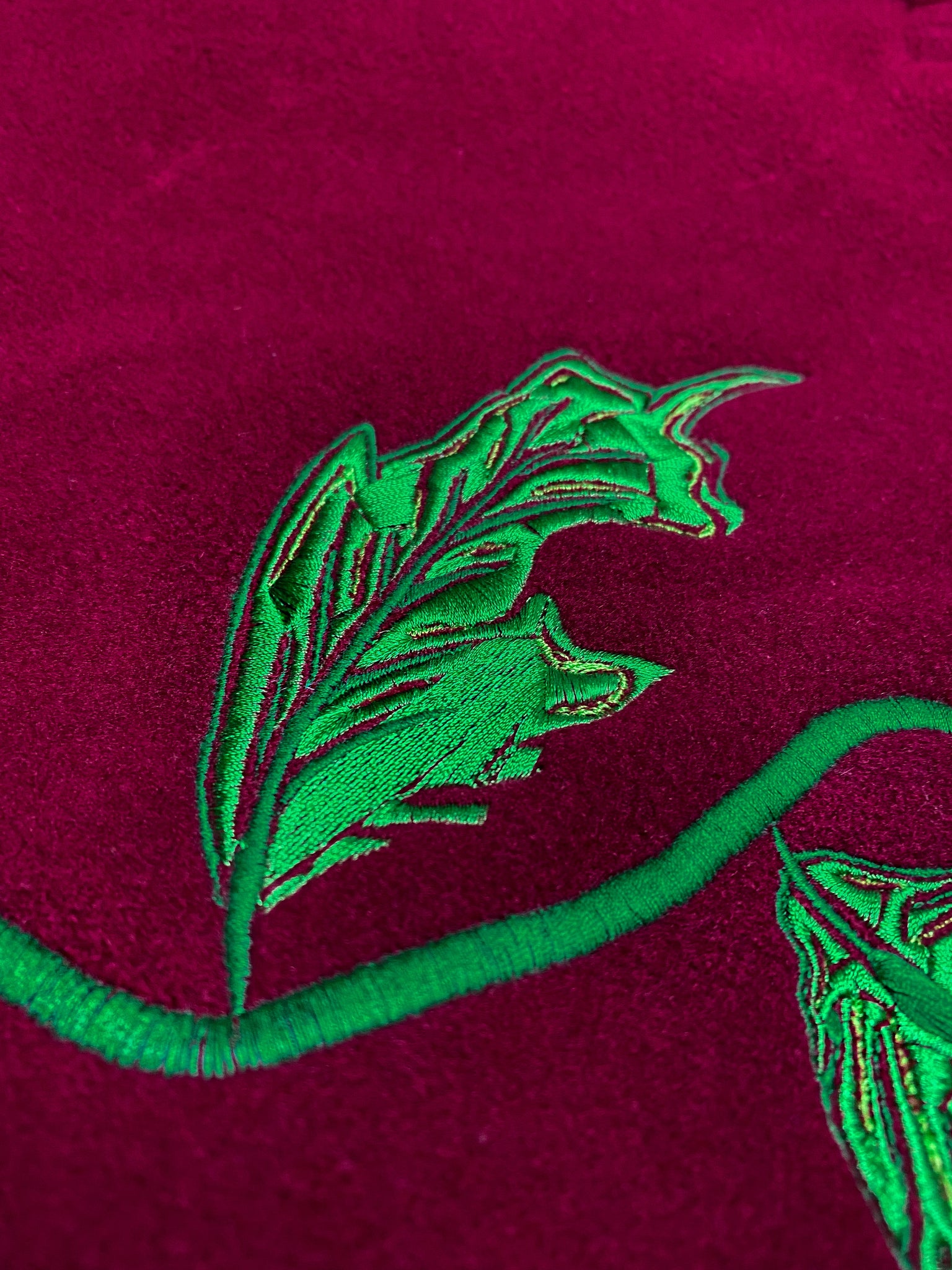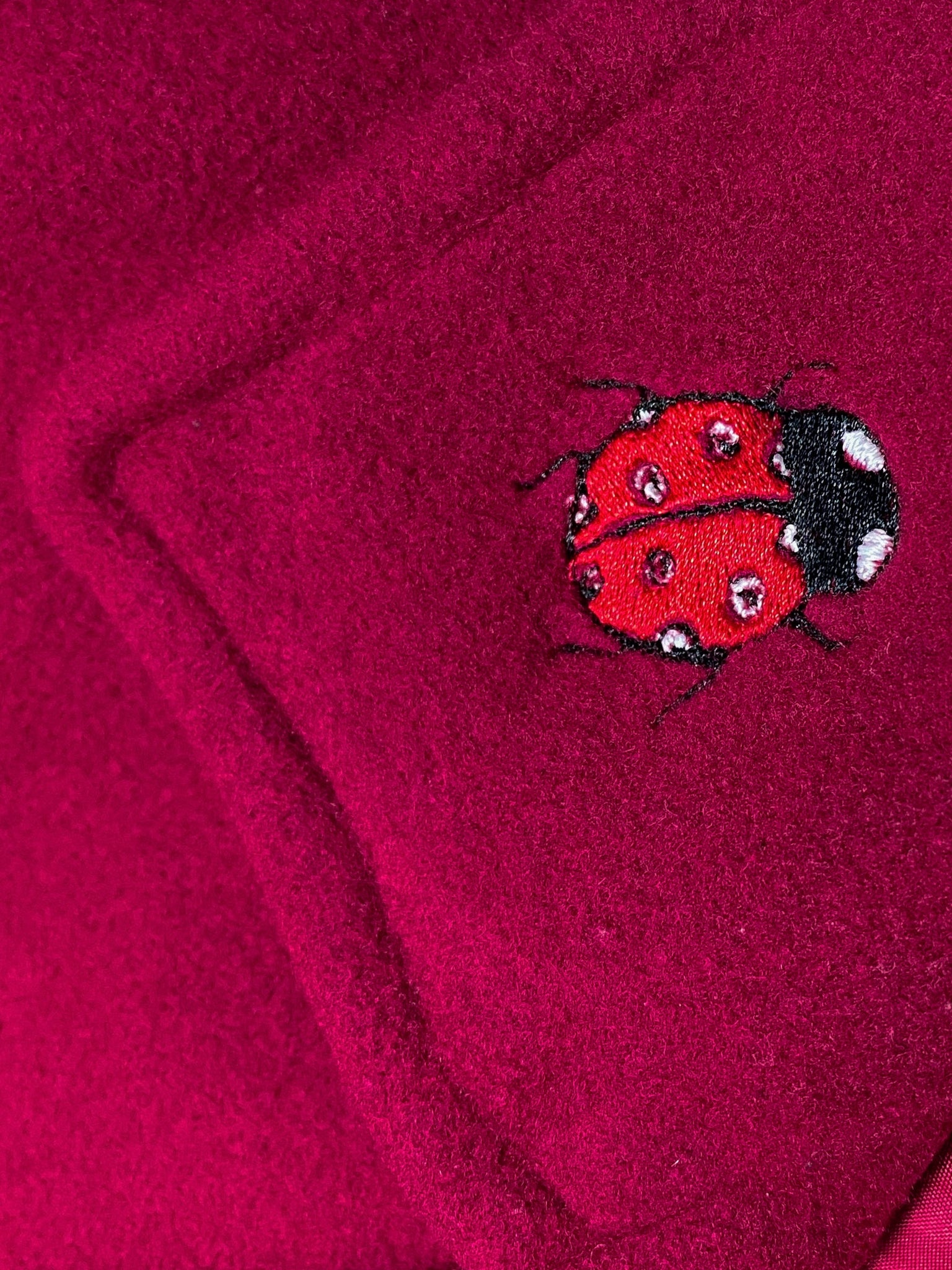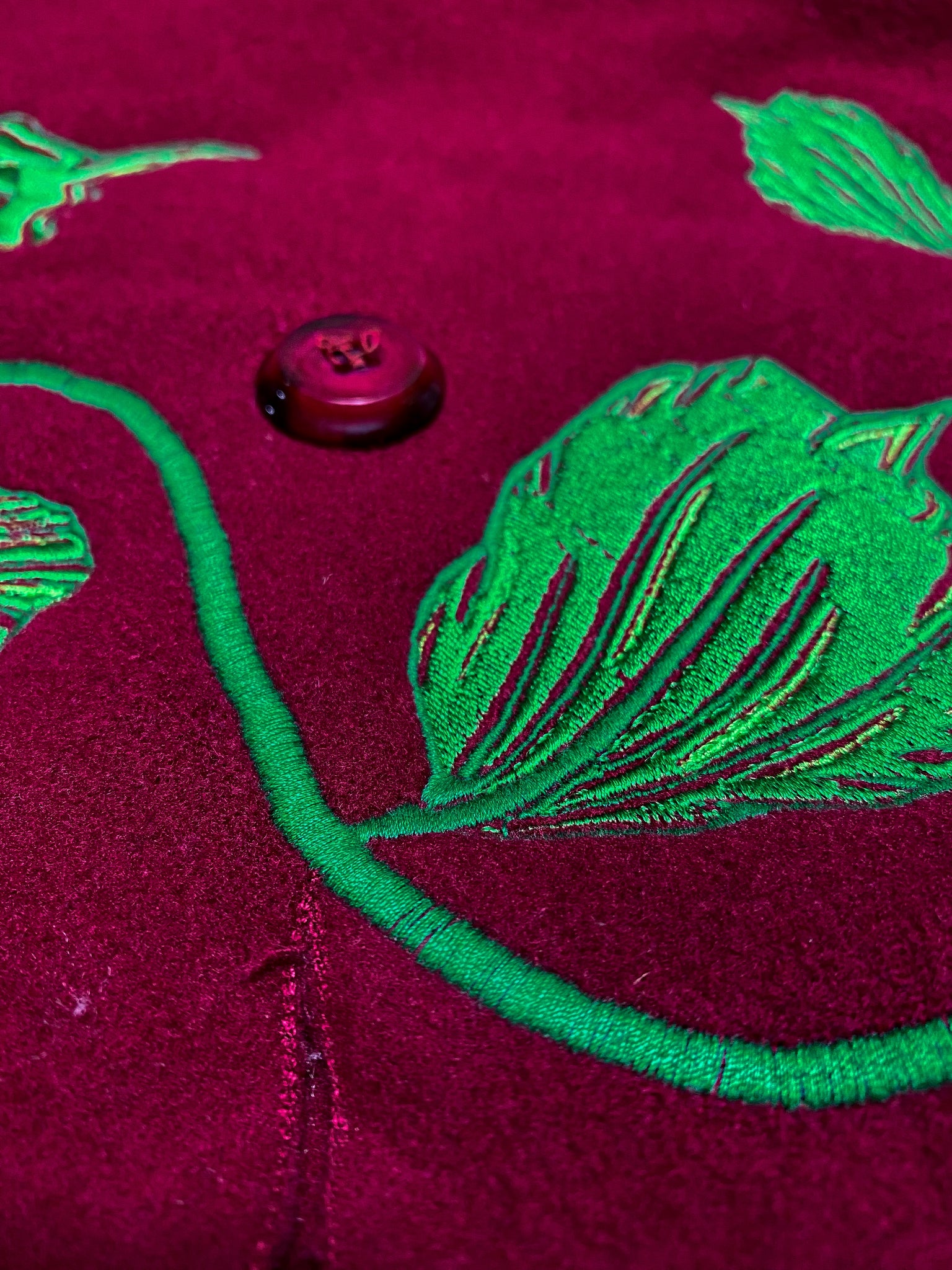 A dark ruby red overcoat, reworked with an embroidered dancing leafy vine, featuring two little ladybirds on the leaf and collar.