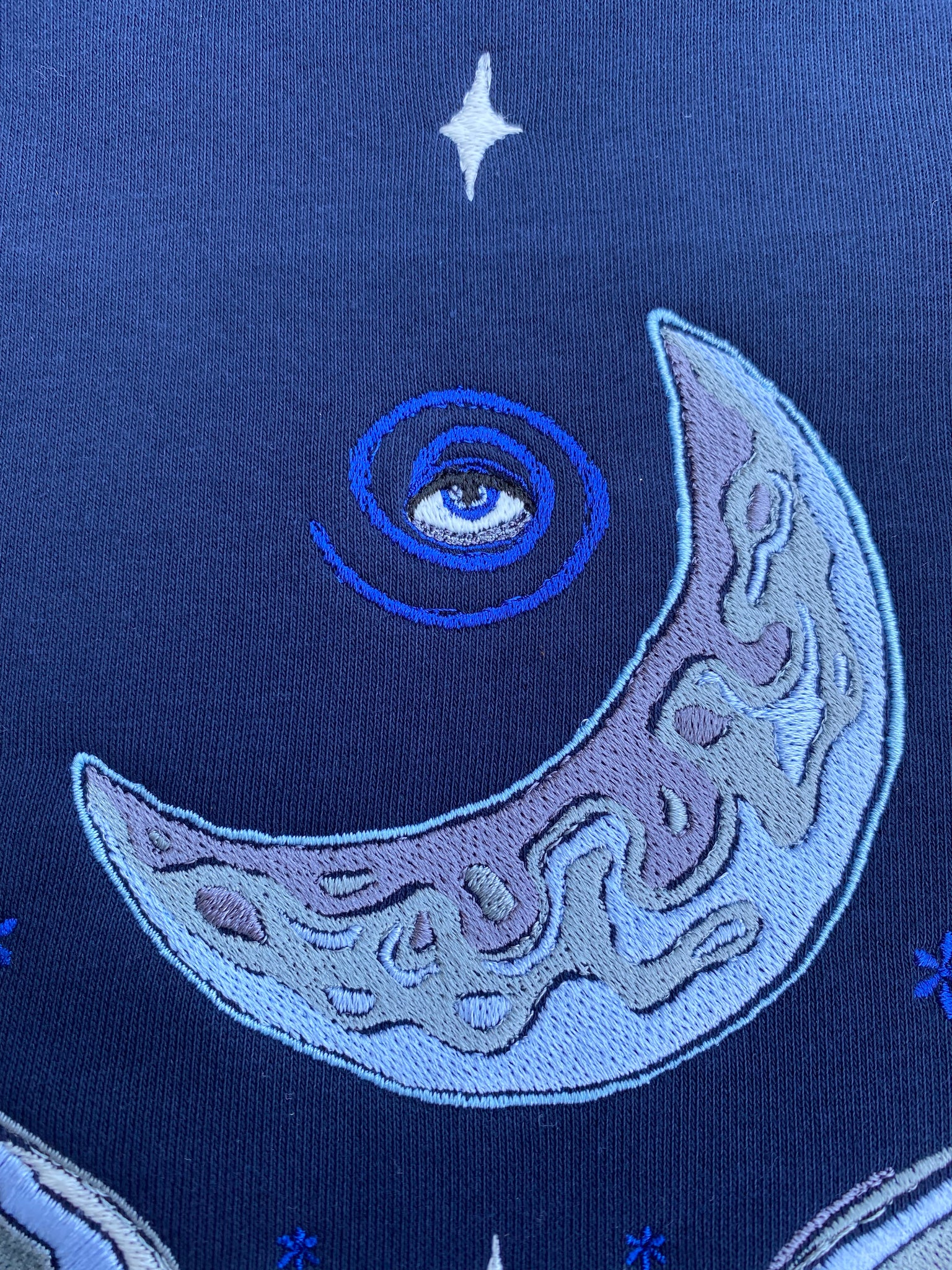 A navy crewneck sweatshirt, complete with an enchanted rabbit and moon array embroidery. Originally designed, drawn, and embroidered by me.