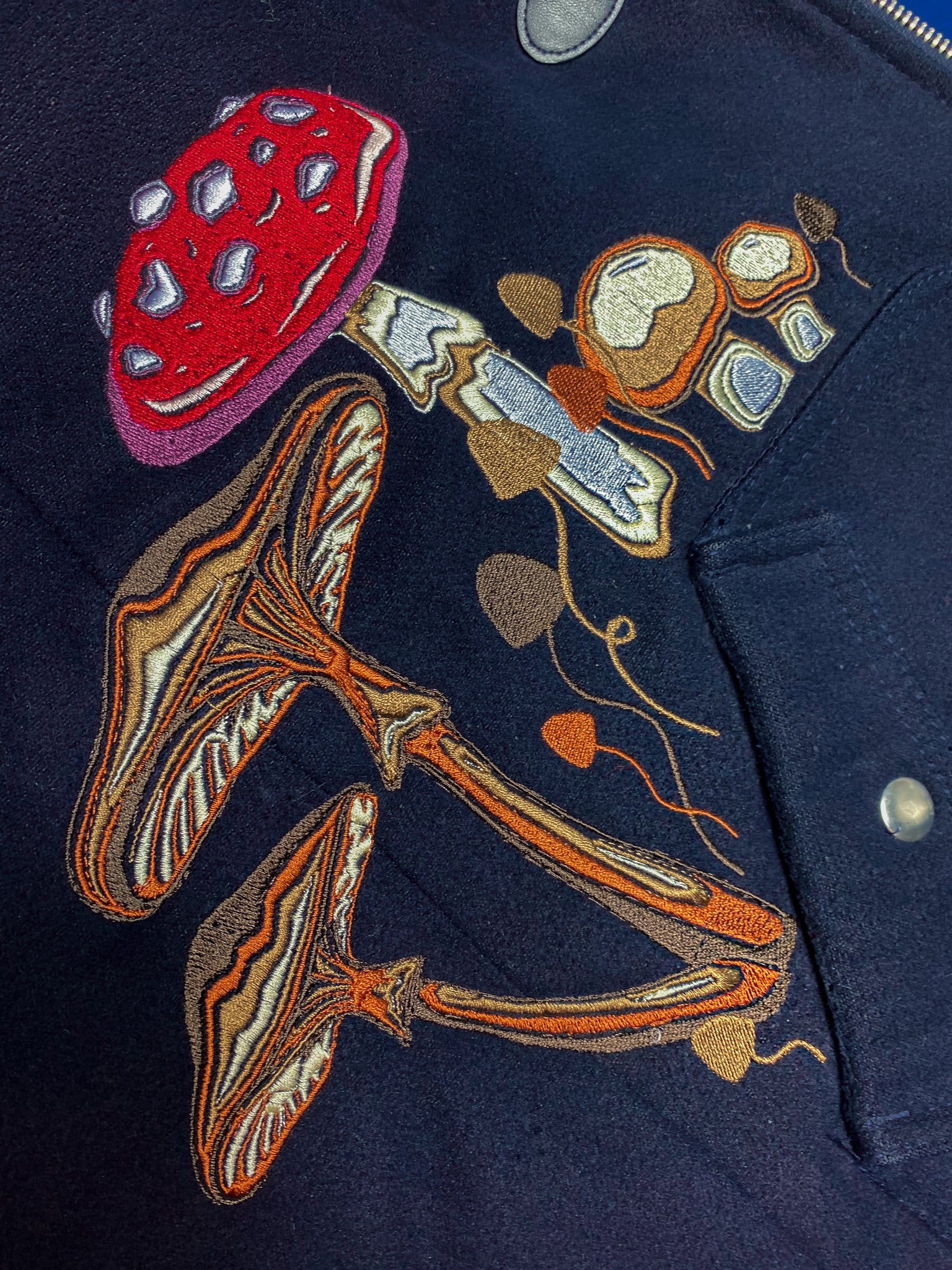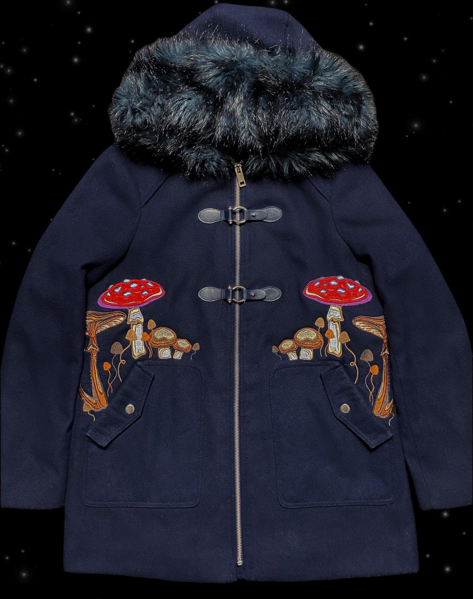 A thick hooded navy riding coat, embroidered with a mirrored array of mushroom creatures growing from the pockets, complete with a faux fur hood.