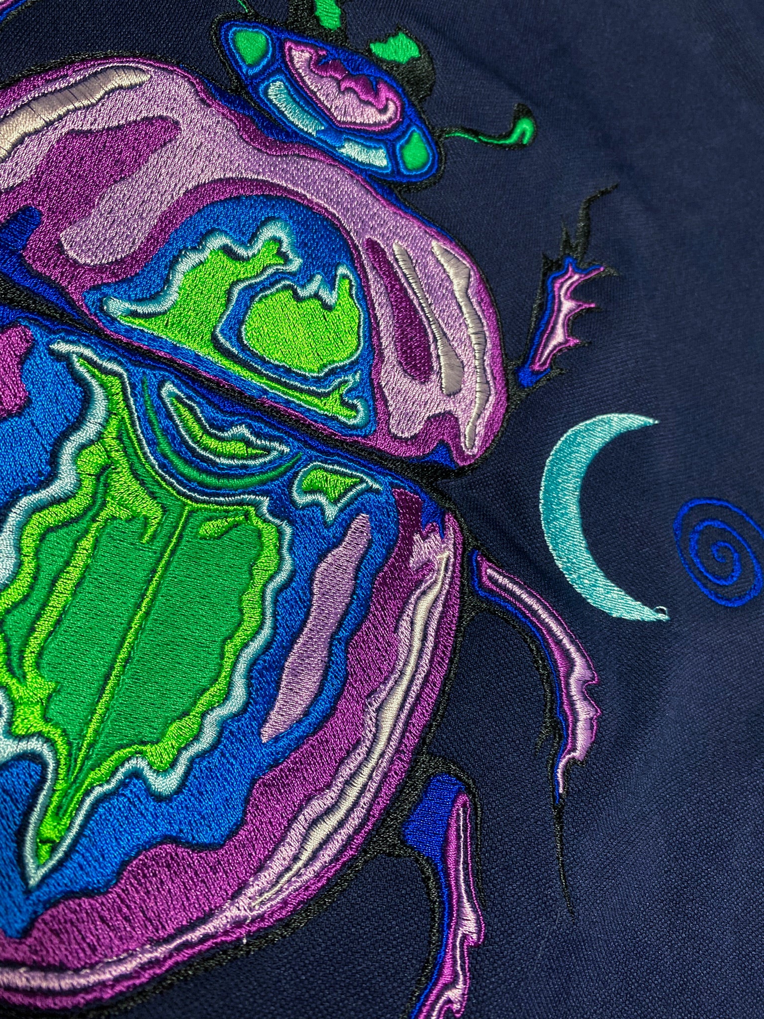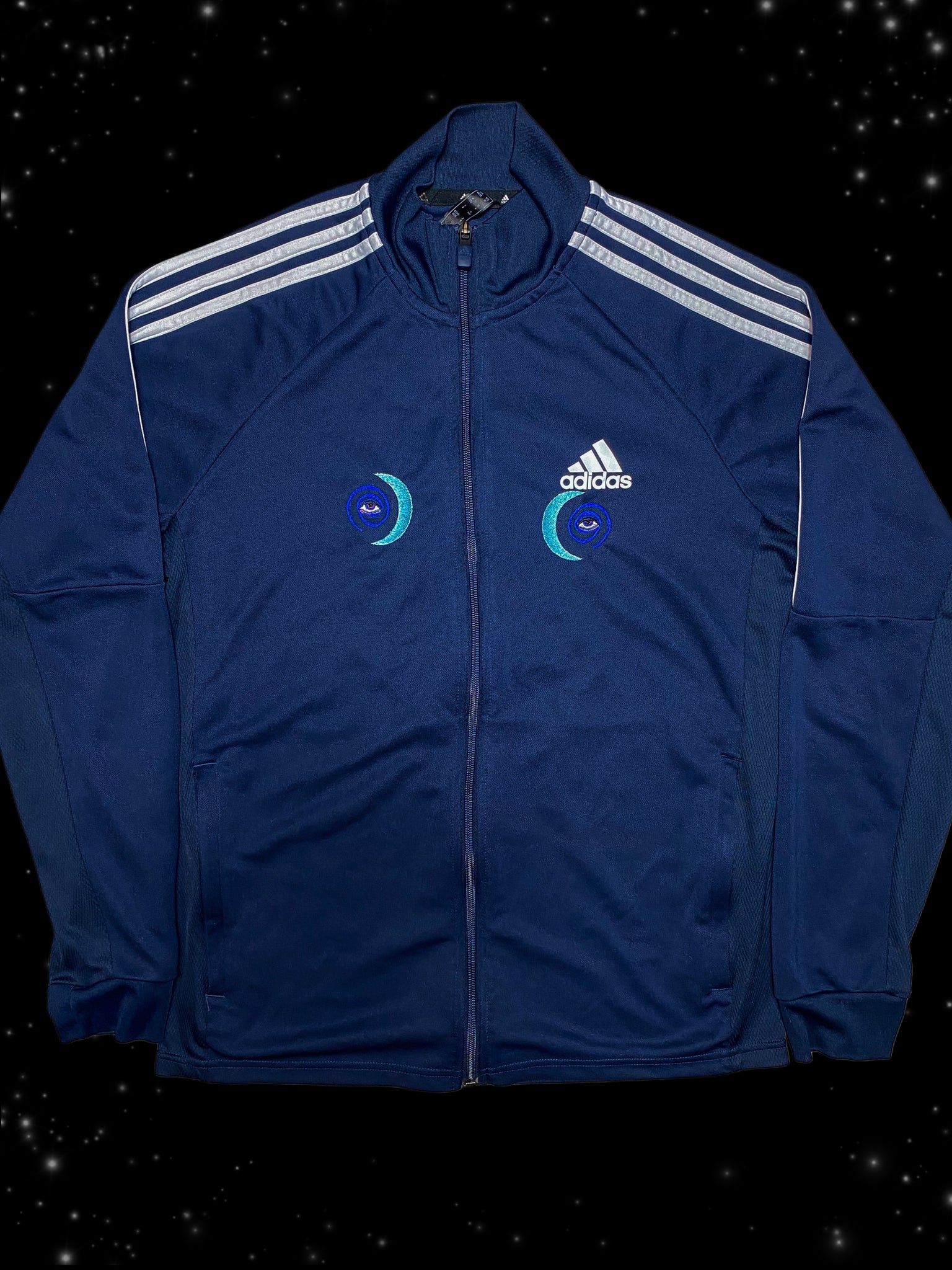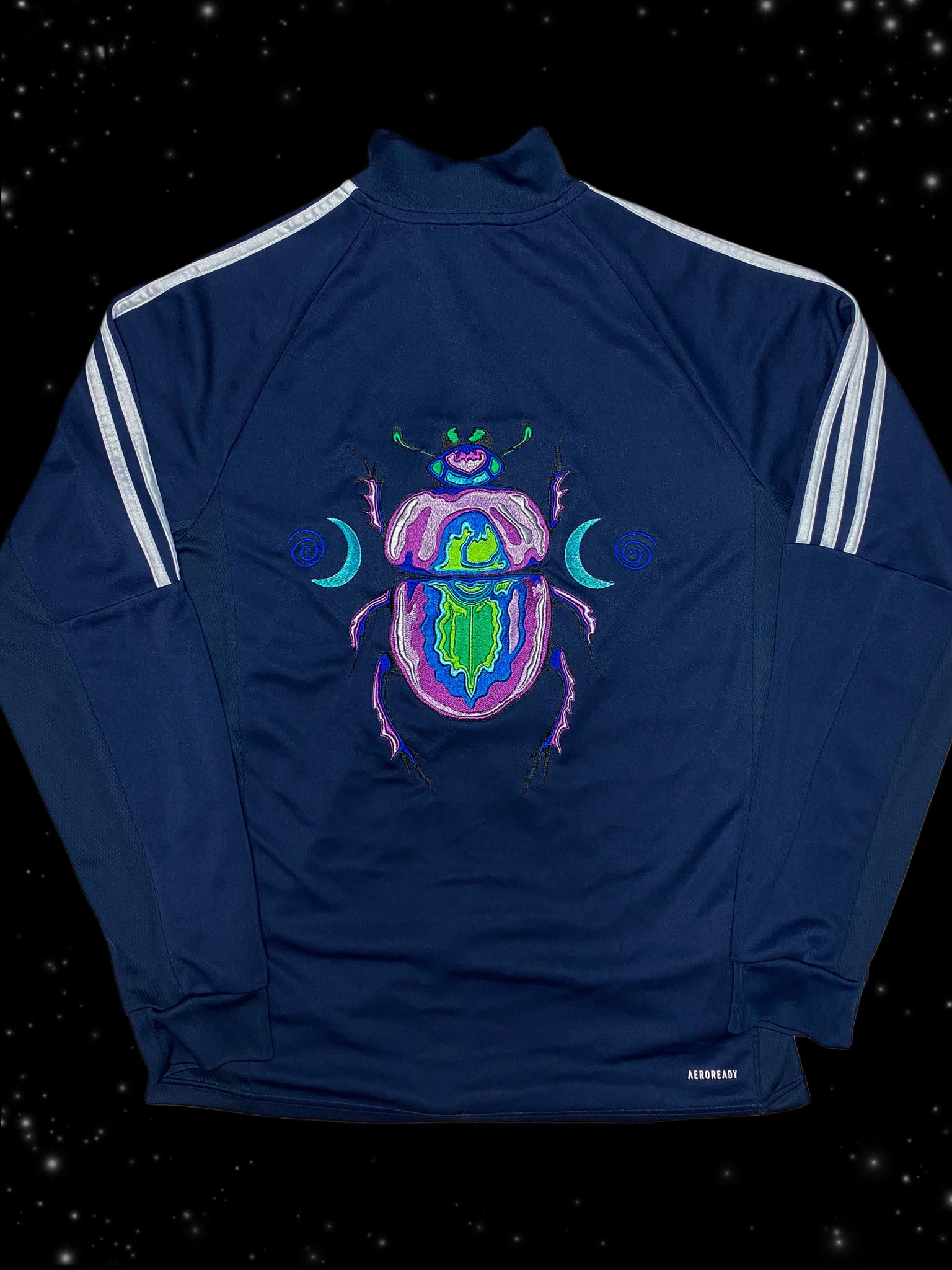 A reworked Adidas zip jacket, embroidered with a prismatic jeweled beetle, spirals, moons, and all seeing portal creatures on the front...