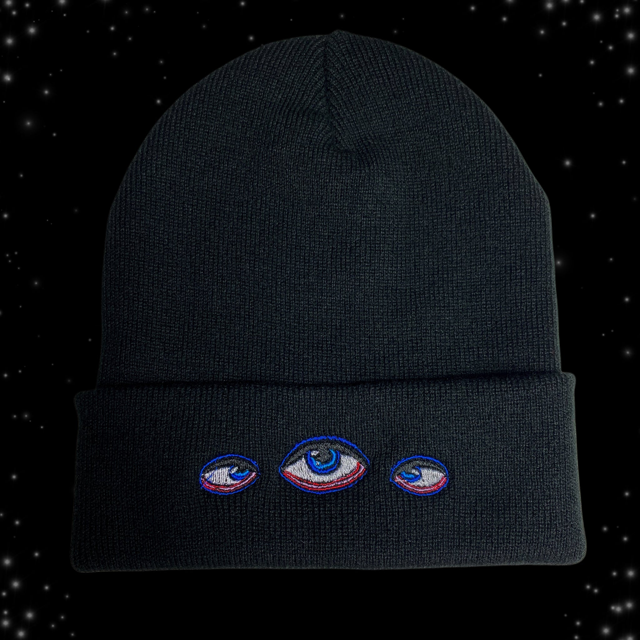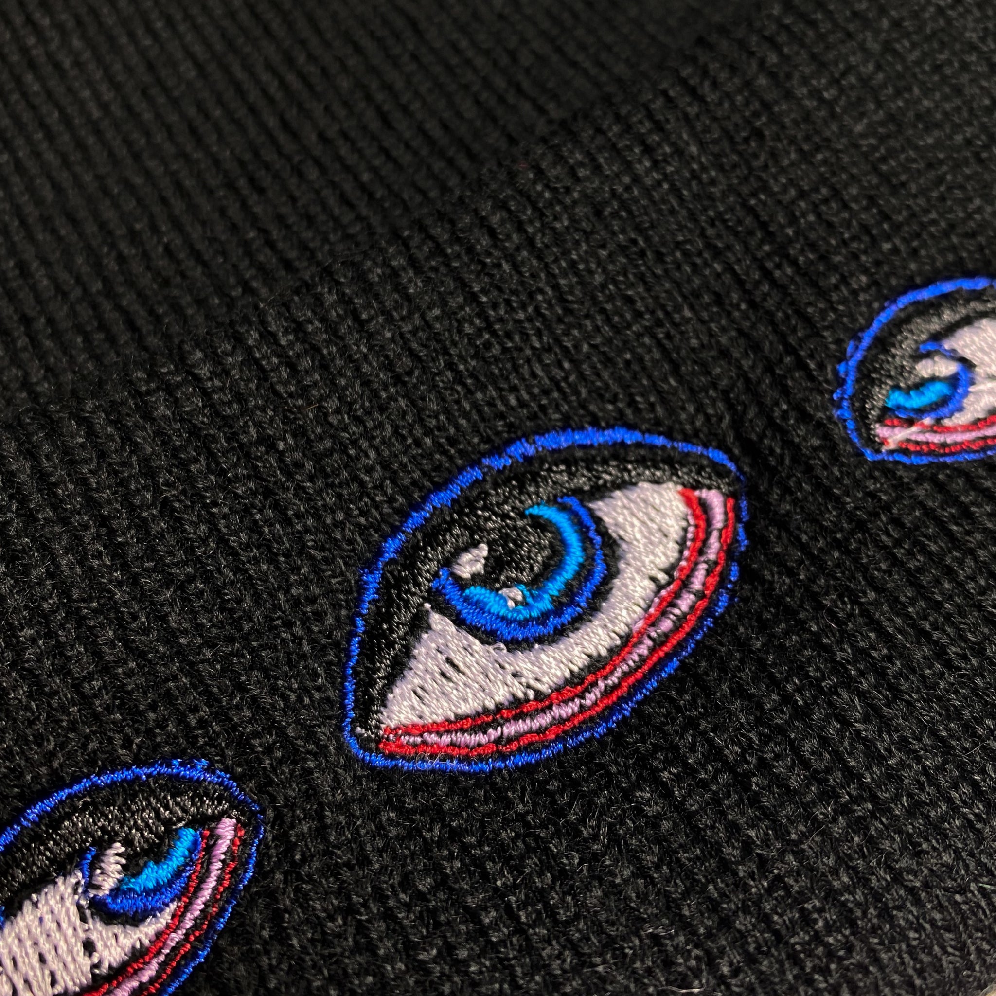 A black beanie, kookily embroidered to mystify and warm your noggin.