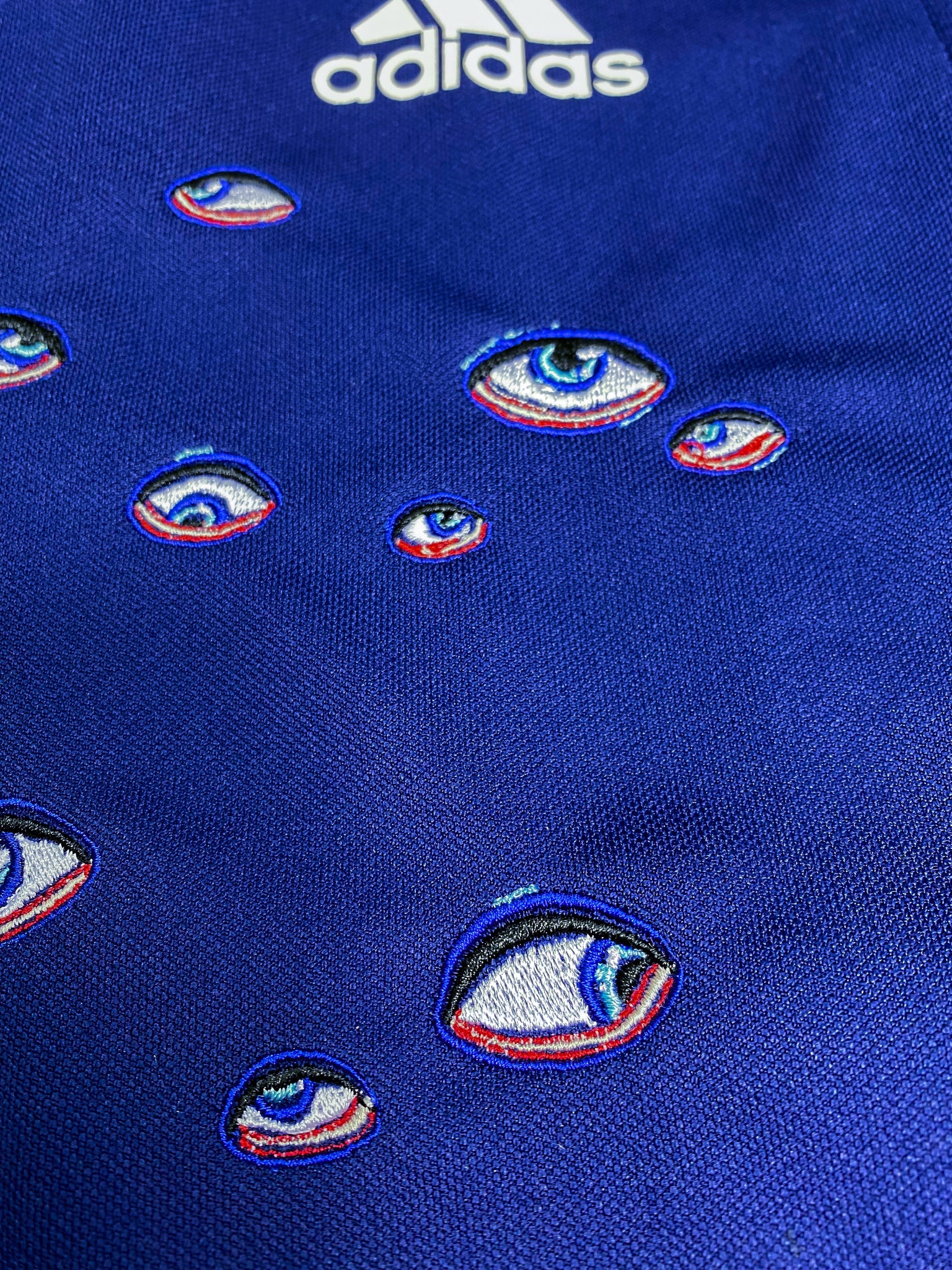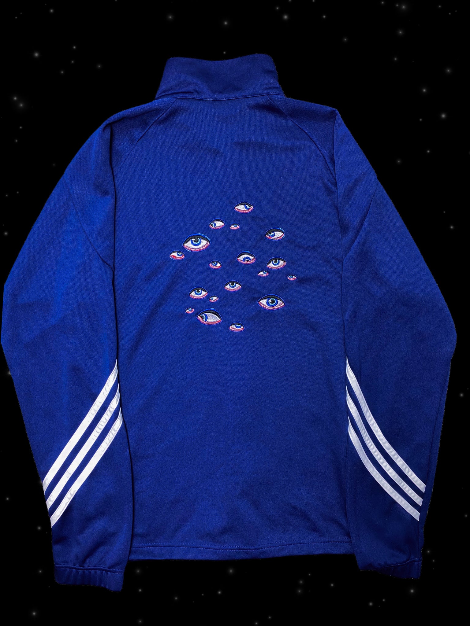 A dark blue vintage Adidas zip up jacket, reworked with an array of embroidered all seeing creature eyes.