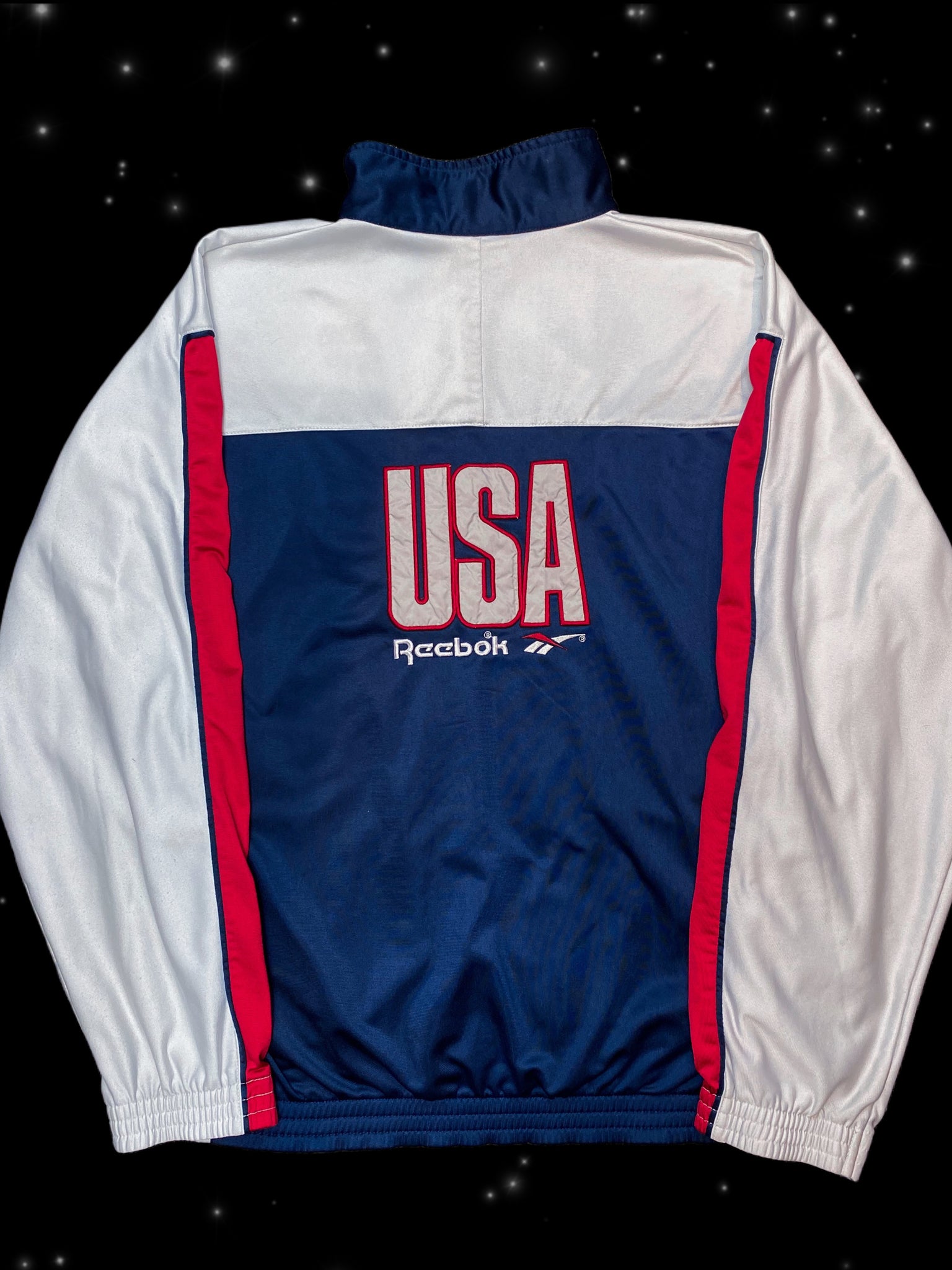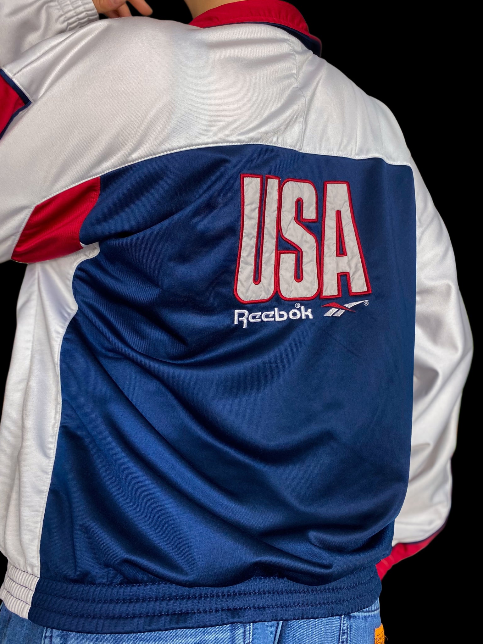 A vintage Reebok zip up jacket, embroidered with a delicious and suspicious apple tree growing from the left pocket…