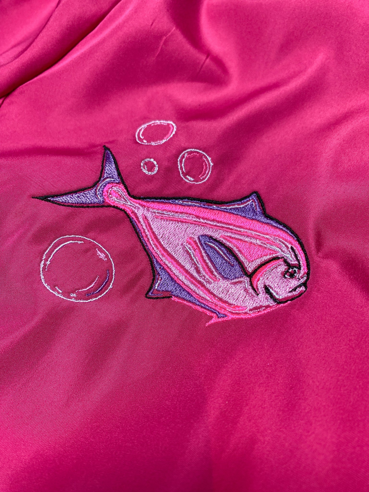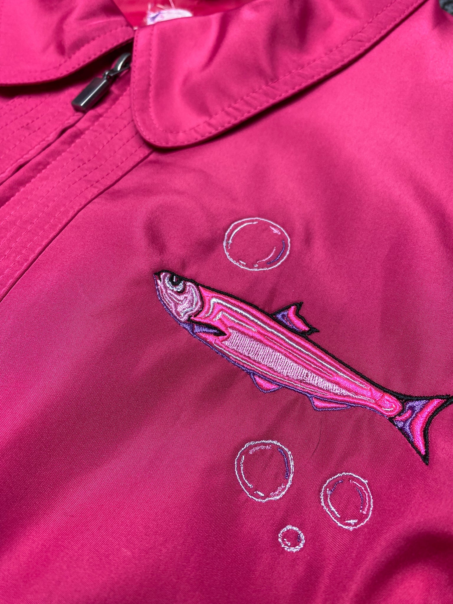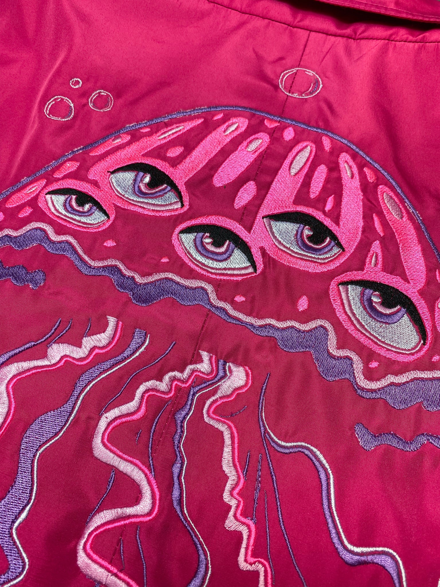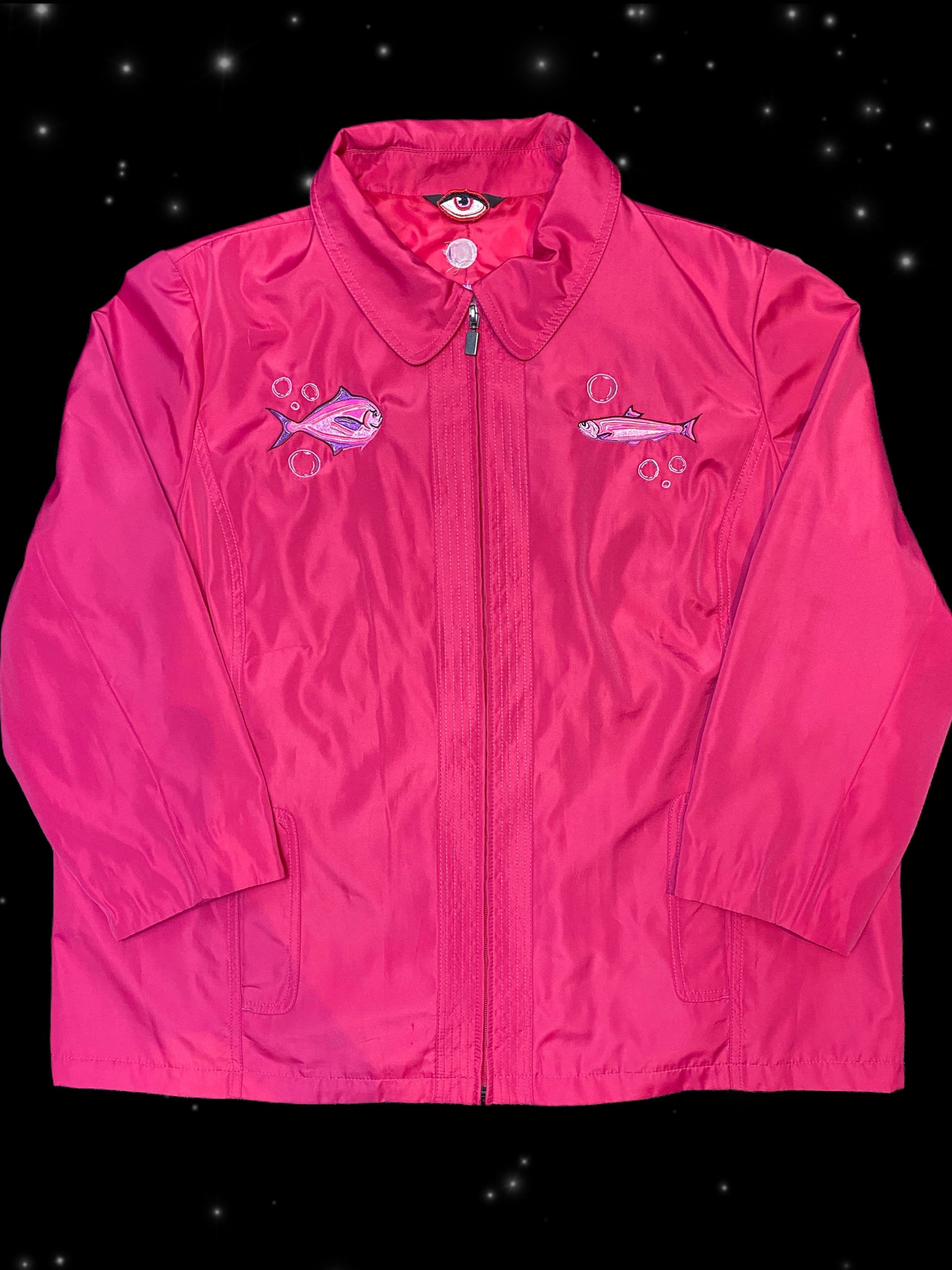 A vibrant pink zip up raincoat, embroidered with a nautical array of pink fishies, bubbles, and a dancing hypnotic jellyfish on the back.